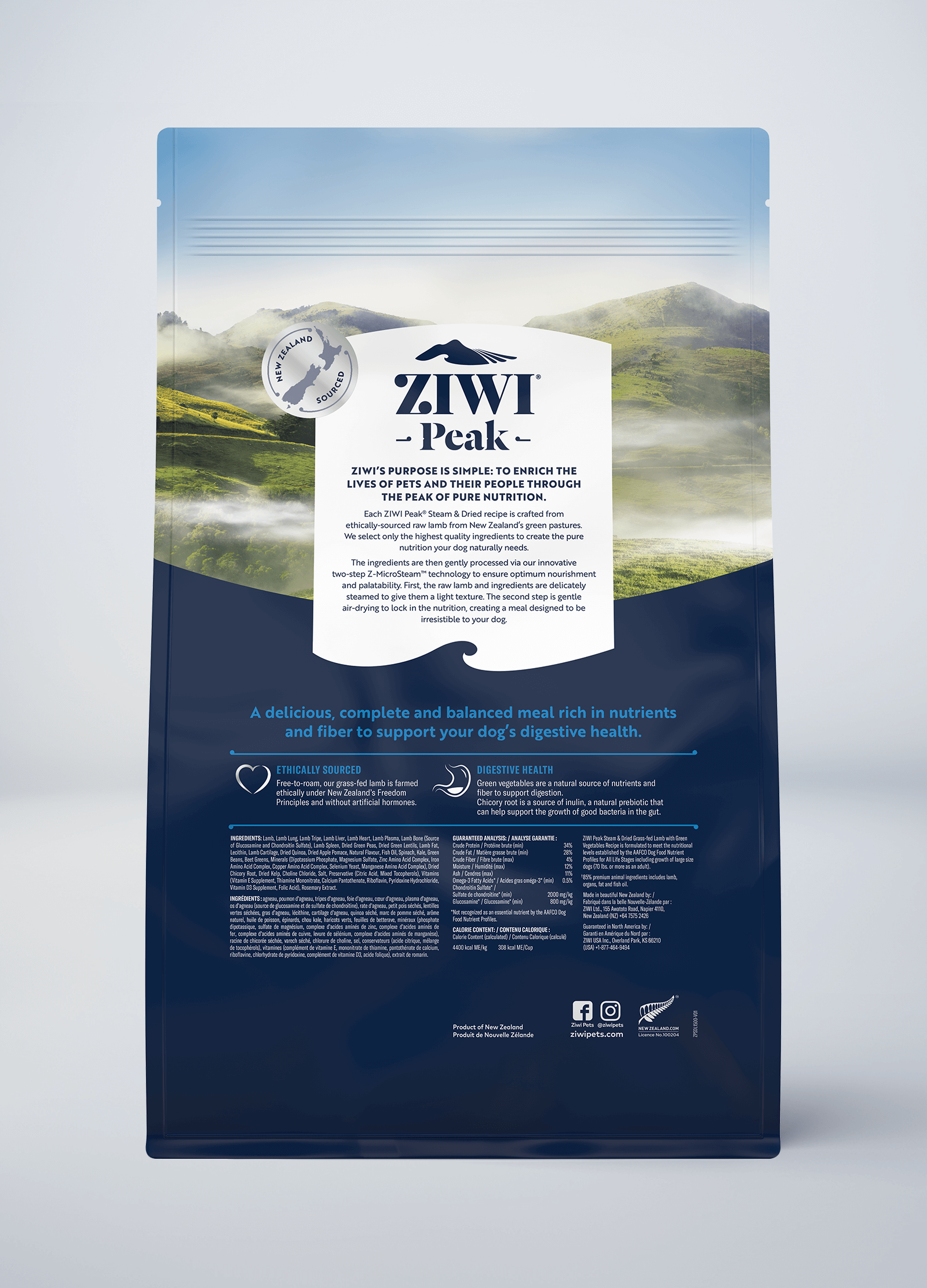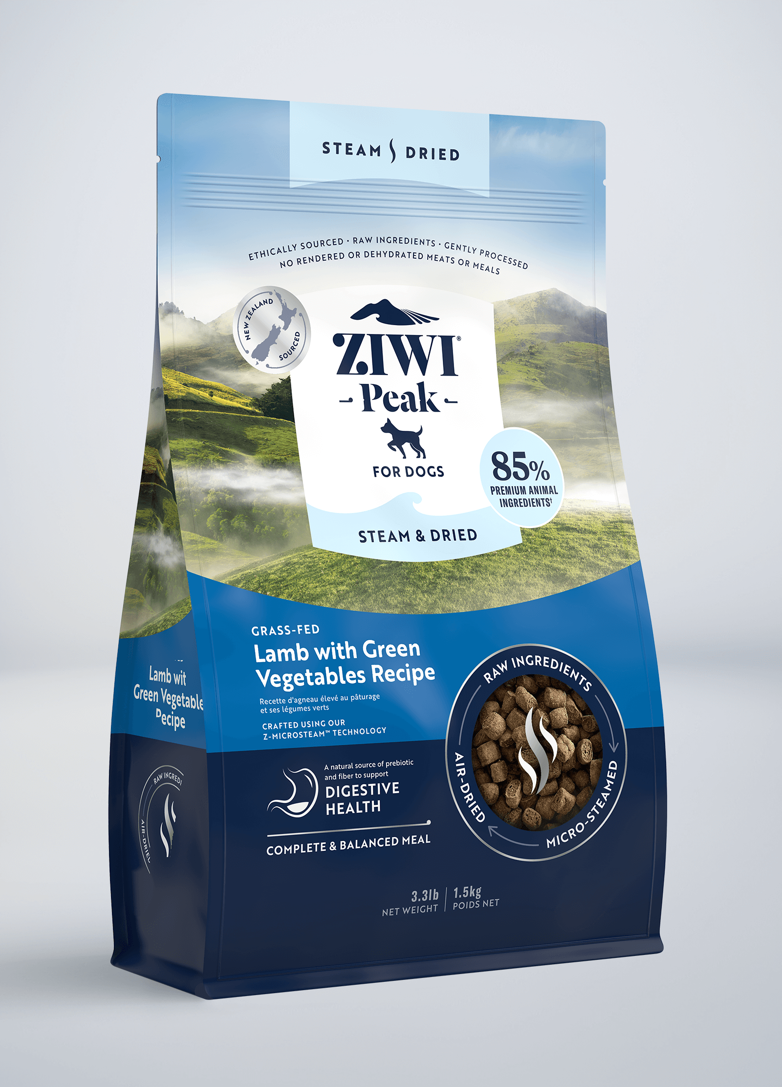 Crafted from ethically-sourced raw lamb from New Zealand’s green pastures with a blend of spinach. kale. green beans. and chicory root to support digestive health. Delicately micro-steamed then gently air-dried via our innovative two-step Z-MicroSteam™ technology to ensure optimum nourishment and palatability.