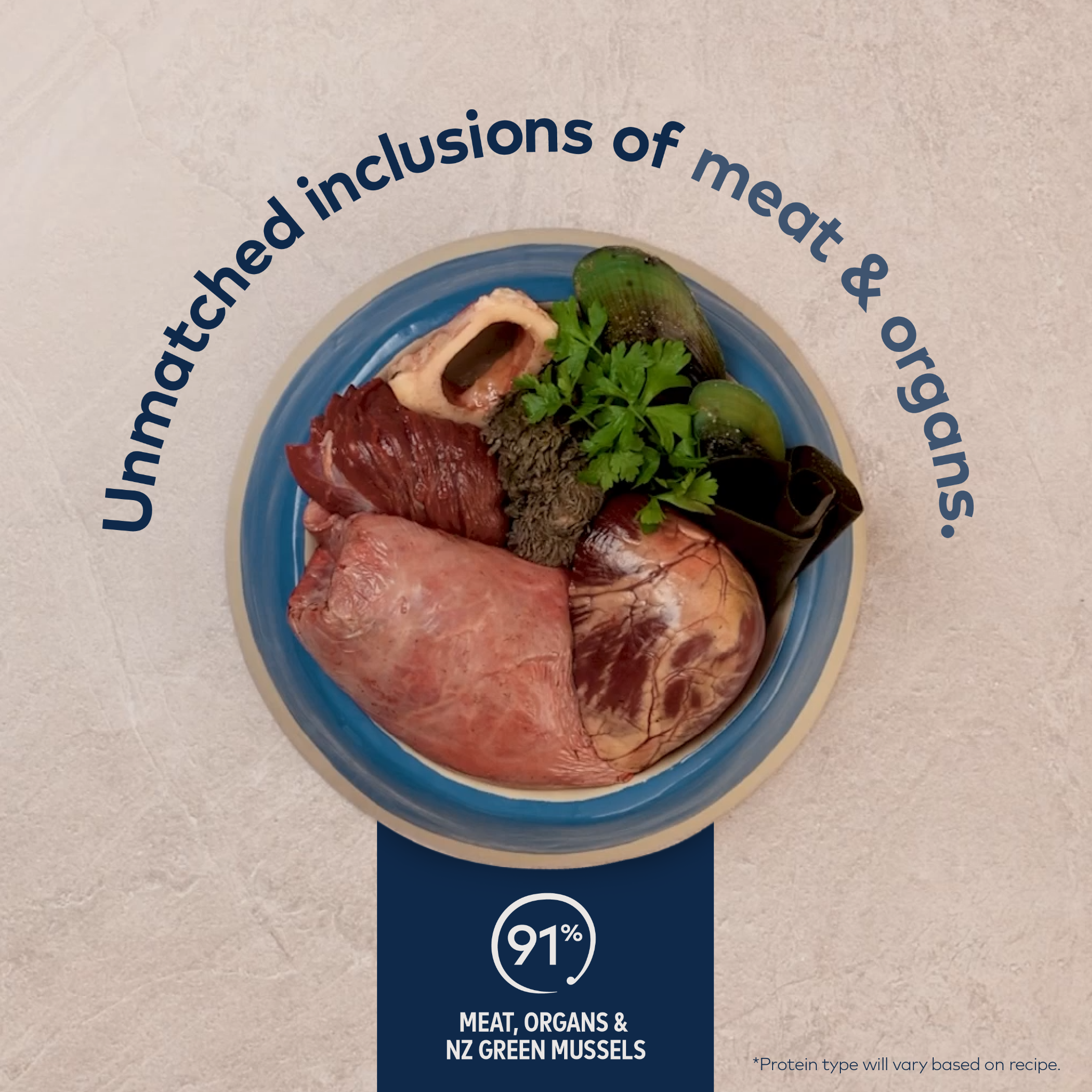 This variety 6 pack of canned wet food for dogs features three cans each of our Beef and Chicken recipes. These recipes are designed to mirror a whole-prey. nutrient dense diet featuring 91% meat. organs. seafood and bone. all ethically-sourced from pure New Zealand. Simple and pure. just like our love for dogs.